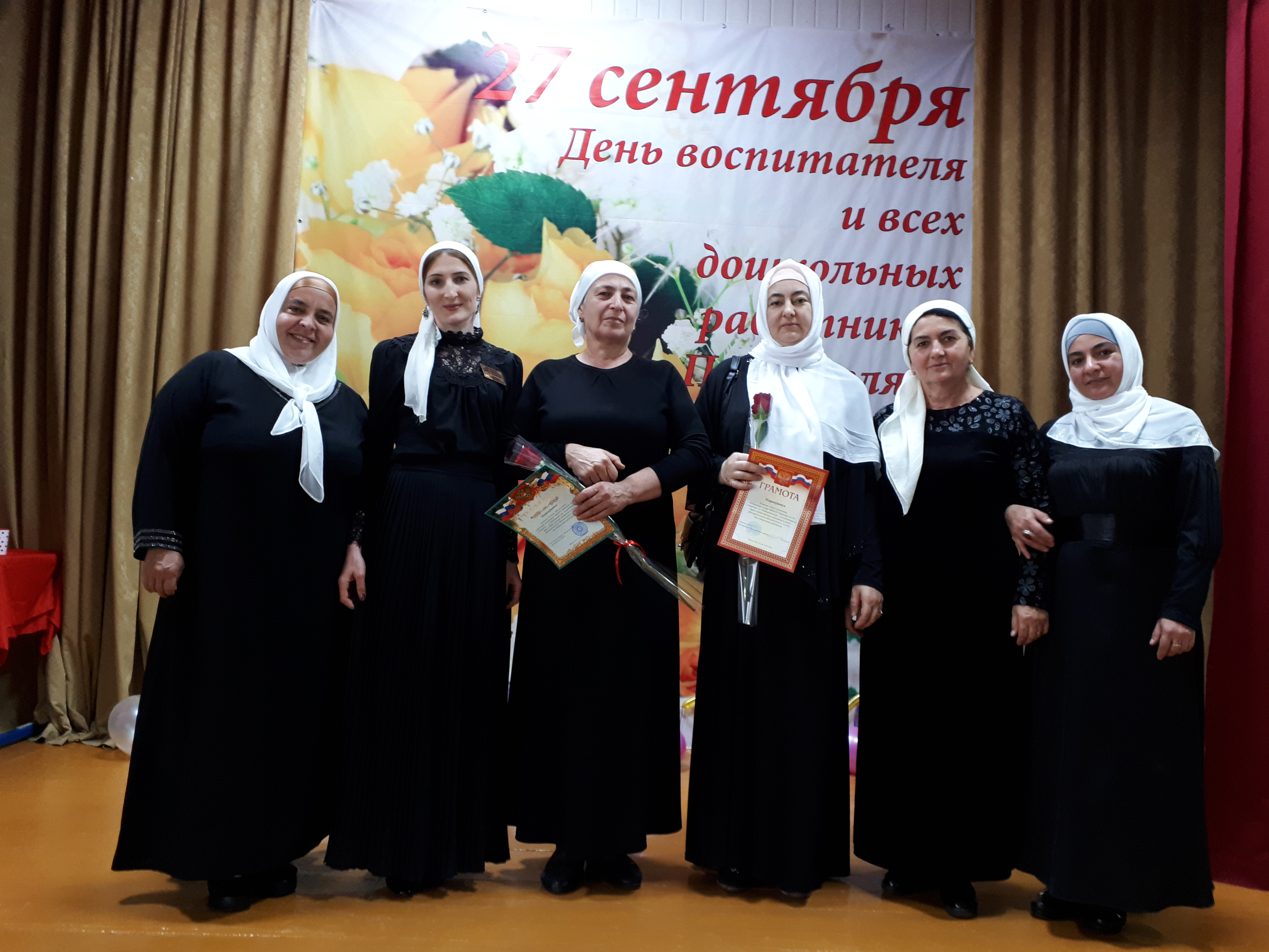 29.09.2018 г в с. Знаменское на базе МБДОУ "Детский сад "Солнышко" прошло районное мероприятие, посвященное Дню воспитателя и всех дошкольных работников, в котором наши сотрудники приняли участие. На этом мероприятии отметили работу наших сотрудников: заведующего хозяйством Матаговой А.А. и медицинской сестры Алхановой Л.С. Они были награждены почетными грамотами МУ "Управления дошкольного образования Надтеречного муниципального района".